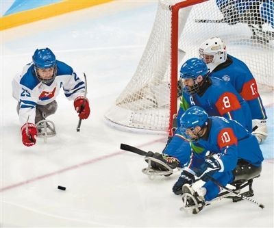 3月6日,北京冬殘奧會冰球小組賽在國家體育館繼續(xù)進(jìn)行。圖為意大利隊(duì)對陣斯洛伐克隊(duì)。本報(bào)記者 蔣雨師攝