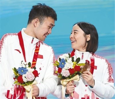 3月6日,北京冬殘奧會高山滑雪女子超級大回轉(zhuǎn)視障組比賽頒獎儀式在北京延慶冬殘奧頒獎廣場舉行。圖為獲得季軍的中國代表團(tuán)運(yùn)動員朱大慶(右)和引導(dǎo)員閆寒寒在頒獎儀式上。新華社記者 雒 圓攝