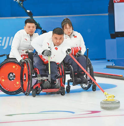 3月6日,中國代表團運動員王海濤(中)在輪椅冰壺循環賽對陣愛沙尼亞隊的比賽中。