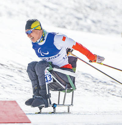 3月6日,中國代表團運動員毛忠武在殘奧越野滑雪男子長距離坐姿組比賽中。