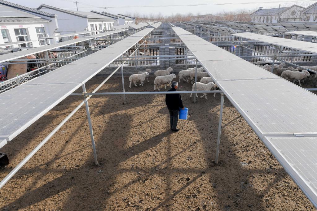 聯星村村民在自家的光伏庭院里飼養羊群(2018年1月22日攝)。新華社記者劉磊攝