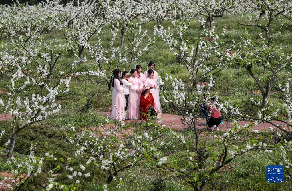 3月11日,在四川省宜賓市高縣勝天鎮,幾名女士在李花叢中留影。