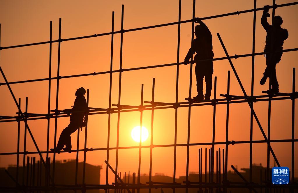 2022年1月1日,在河北雄安新區(qū)容西安置房項目D標(biāo)段施工現(xiàn)場,中鐵上海工程局工人在新年第一縷陽光的照耀下工作。新華社發(fā)(傅新春 攝)