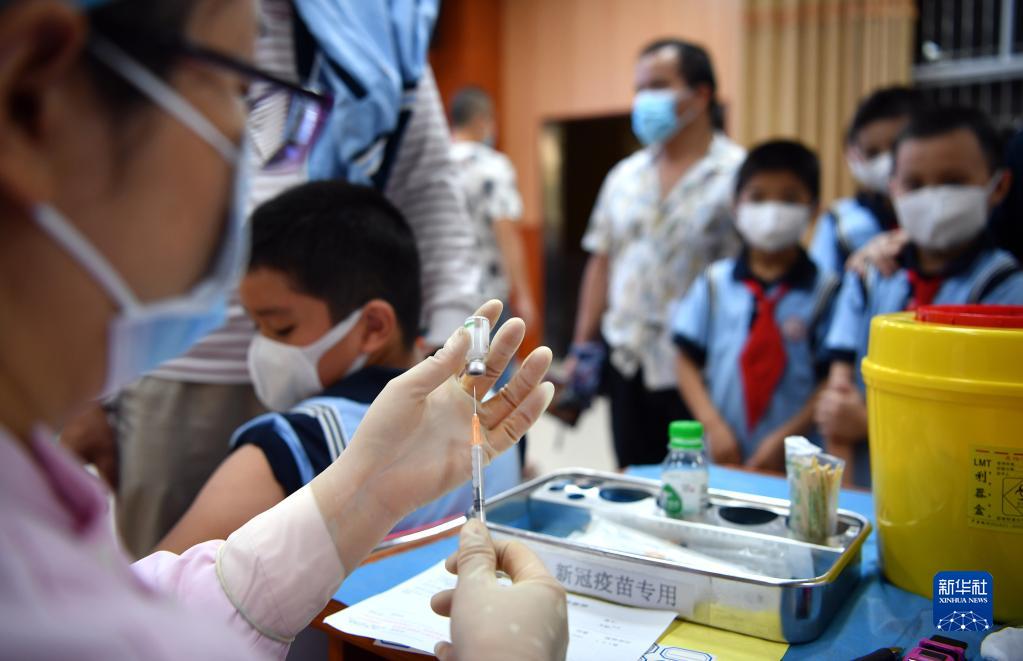 醫(yī)護(hù)人員在海口市瓊山第三小學(xué)為學(xué)生接種疫苗(2021年10月28日攝)。新華社記者 郭程 攝