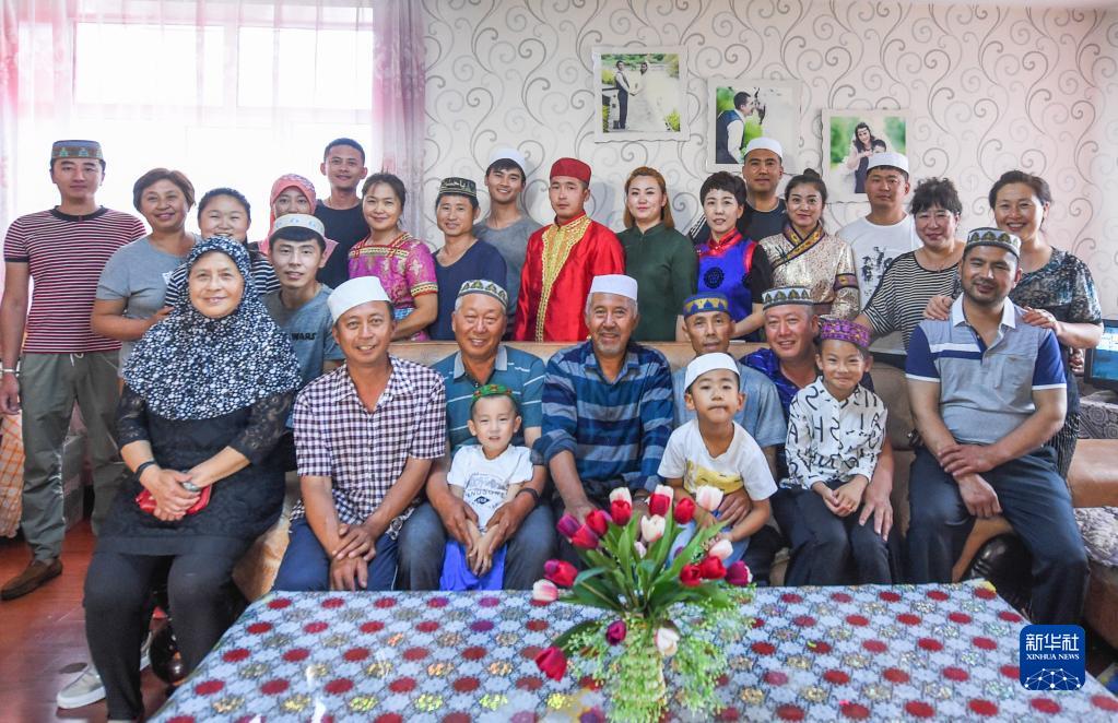 這是家住內(nèi)蒙古呼倫貝爾的夏民山(前排右三)家的家庭合影。他家由回族、漢族、蒙古族、達(dá)斡爾族、鄂溫克族、滿族共6個民族組成,45口人,三代同堂(2017年7月16日攝)。新華社記者 連振 攝