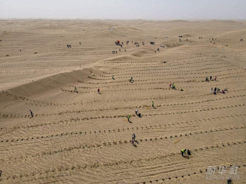 人們在距離新疆且末縣城不遠處的塔克拉瑪干沙漠內植樹(無人機照片,2021年3月28日攝)。