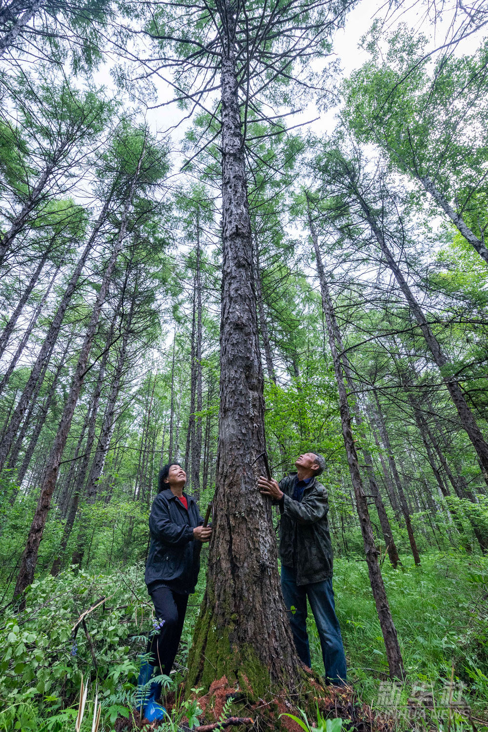 2021年6月3日,在黑龍江省伊春市烏馬河林業局有限公司烏馬河林場分公司施業區,張英善、燕玉平夫婦查看他們30多年前種下的樹。幾十年來,夫妻二人親手栽下100多萬株樹。