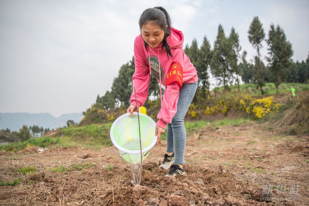 2022年3月10日,在重慶市渝北區木耳鎮金剛村,參加助農植樹活動的志愿者為剛栽種的樹苗澆水。