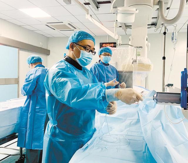 漢川市人民醫院介入血管外科醫生正在進行一例髂動脈夾層覆膜支架植入術