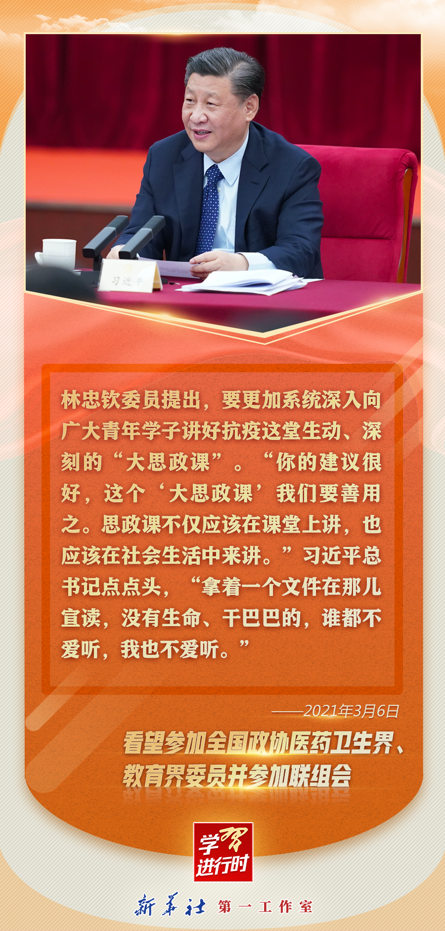 ——2021年3月6日,在看望參加全國政協十三屆四次會議的醫藥衛生界、教育界委員并參加聯組會時的講話