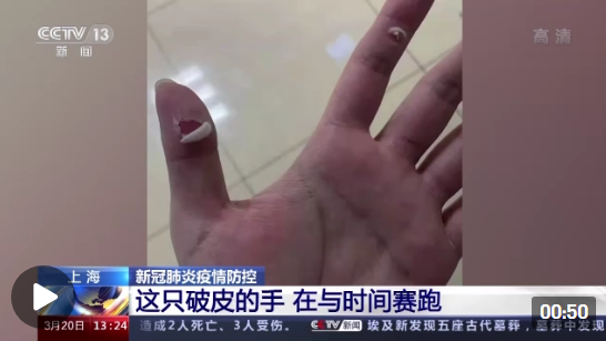上海市第七人民醫院檢驗科 羅嘉俊:在換手套的時候,我突然發現我的皮已經破爛不堪了。