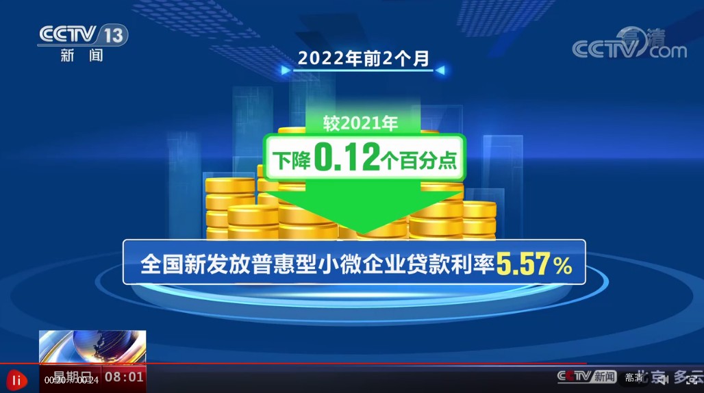 央視網(wǎng)消息:銀保監(jiān)會數(shù)據(jù)顯示,截至2月末,全國普惠型小微企業(yè)貸款余額19.67萬億元,同比增速達到22.16%,較各項貸款增速高11.15個百分點。今年前兩個月,全國新發(fā)放普惠型小微企業(yè)貸款利率5.57%,較2021年下降0.12個百分點。