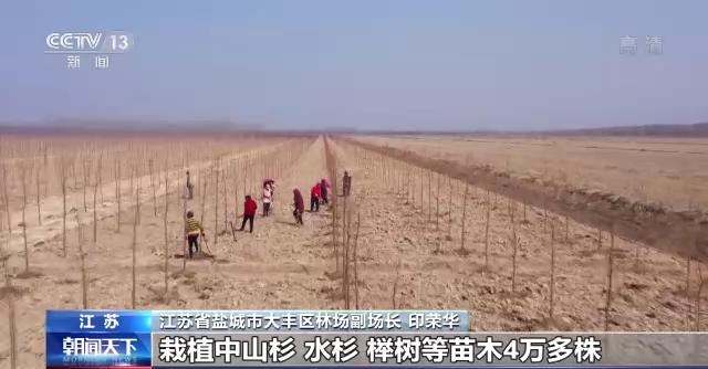 江蘇省鹽城市大豐區林場副場長 印榮華:我們沿海防護林三期工程一共1200畝,目前已完成造林800畝,栽植中山杉、水杉、櫸樹等苗木4萬多株,這樣就進一步增加我們森林資源總量,使沿海生態防護林功能更加完善。