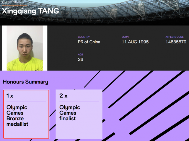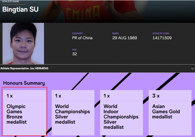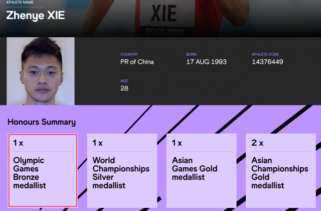 據(jù)國際田聯(lián)官網(wǎng)信息,國際田聯(lián)的運動員介紹中,蘇炳添、謝震業(yè)、吳智強、湯星強的資料上都標注了奧運會銅牌。恭喜中國接力隊!