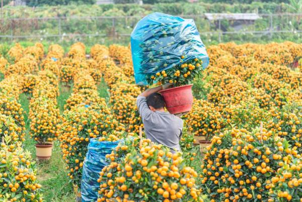 △2022年1月21日,廣州南沙區(qū)魚窩頭細(xì)瀝村的農(nóng)田上種植了大量年橘盆栽,枝頭上掛滿了果實,正在現(xiàn)場出售中。