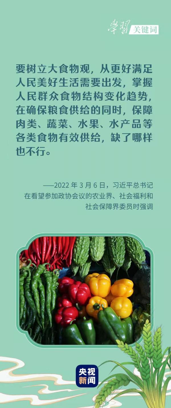 3月6日,習(xí)近平總書記在看望參加全國政協(xié)十三屆五次會議的農(nóng)業(yè)界、社會福利和社會保障界委員時,強調(diào)要樹立大食物觀,從更好滿足人民美好生活需要出發(fā),掌握人民群眾食物結(jié)構(gòu)變化趨勢,在確保糧食供給的同時,保障肉類、蔬菜、水果、水產(chǎn)品等各類食物有效供給,缺了哪樣也不行。