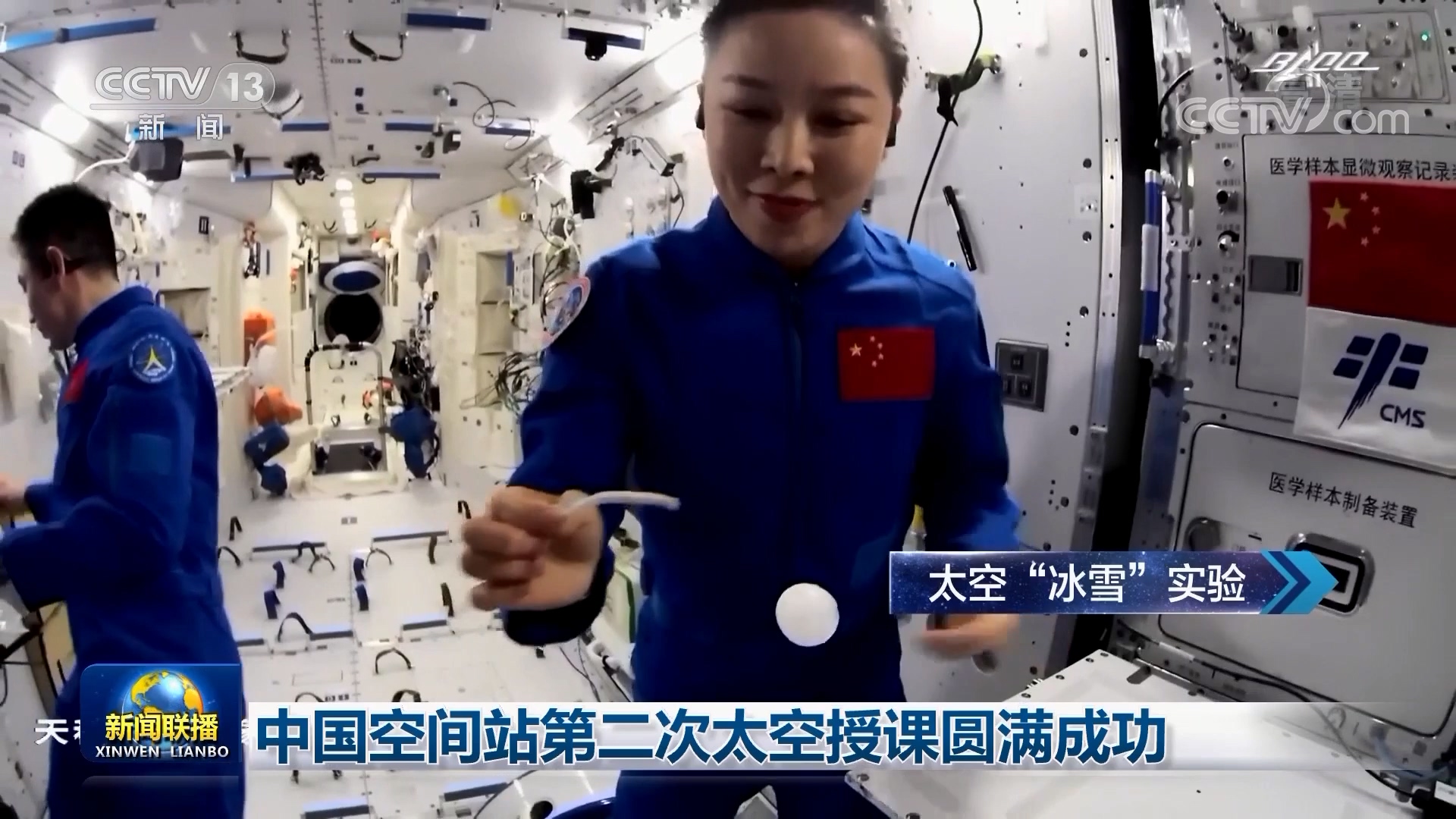 這是太空“冰雪”實驗,向同學們演示失重狀態下的飽和液體結晶現象。