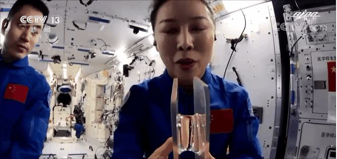 航天員 王亞平:同學們好,我是太空教師王亞平。今天,我想給大家展示另外一個有趣的現象,這個現象還和我們國家的一項非物質文化遺產有關,請大家仔細觀察。