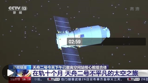 北京航天飛行控制中心貨運飛船任務總師 鄒雪梅:實驗完成了以后,天舟二號按計劃要實施離軌,我們目前是兩次的這樣一個離軌的控制,最終在受控的狀態下再入到南太平洋,在再入過程當中會徹底解體燒毀,不會對地面、海面的這些設施、船只帶來影響。