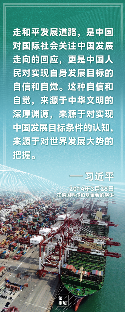 中國走和平發(fā)展道路,不是權(quán)宜之計,更不是外交辭令,而是從歷史、現(xiàn)實、未來的客觀判斷中得出的結(jié)論,是思想自信和實踐自覺的有機統(tǒng)一。進入新時代以來,習近平在多個場合,這樣闡述——