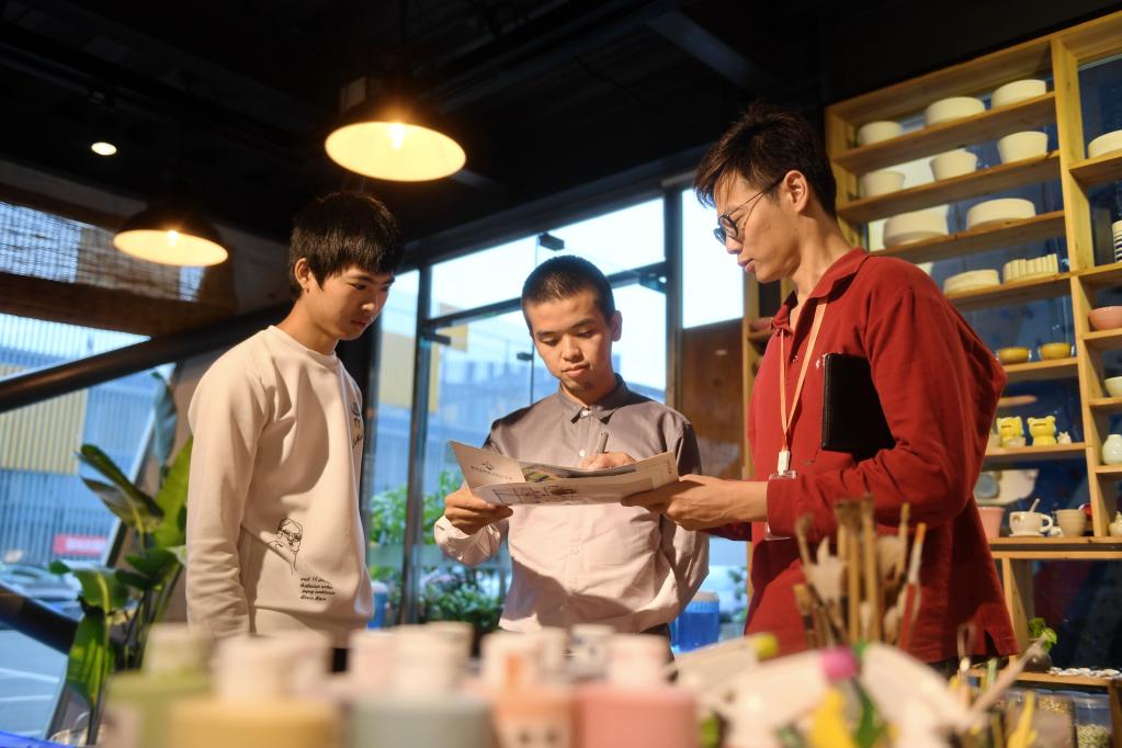 在福州市臺灣青年創(chuàng)業(yè)就業(yè)基地,臺灣青年(右一)討論產品策劃方案。新華社記者 林善傳 攝