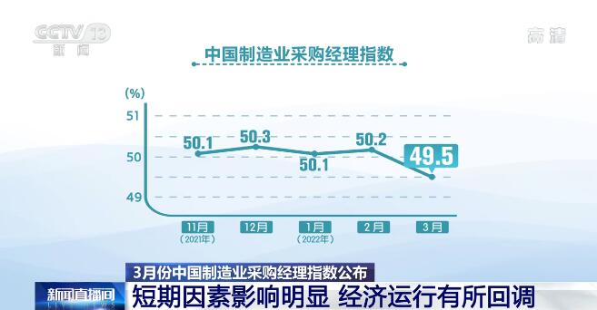 中國物流與采購聯合會副會長 蔡進:3月份采購經理指數確實有一定幅度的回落,回落的因素還是短期因素為主導,主要還是全國多地散發的疫情影響比較大。現在來看采購經理指數在49.5%這么一個水平,雖然有回落,但是總體上也還是反映出來中國經濟的抗壓性還是比較強的。