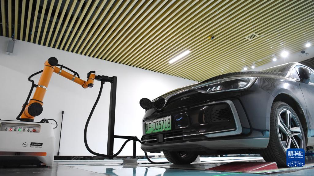 在雄安新區(qū)劇村變電站智慧充電區(qū),插拔槍機(jī)器人為一輛電動汽車充電(3月18日攝)。新華社記者 朱旭東 攝
