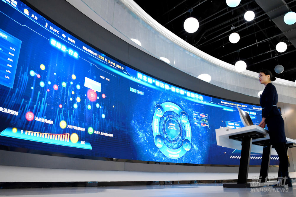 位于雄安新區(qū)首座新建220千伏變電站——?jiǎng)〈逭緝?nèi)的“碳達(dá)峰、碳中和”監(jiān)測(cè)平臺(tái),通過(guò)電力大數(shù)據(jù)折算碳排放量,對(duì)雄安新區(qū)碳排放、碳減排、碳匯進(jìn)行實(shí)時(shí)監(jiān)測(cè)分析(2022年3月18日攝)。