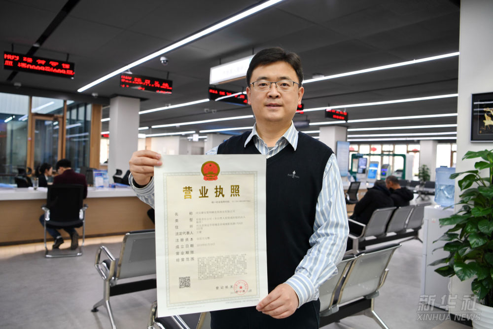 一家入駐雄安新區(qū)的企業(yè)工作人員在市民服務(wù)中心內(nèi)展示辦理的營(yíng)業(yè)執(zhí)照(2019年1月17日攝)。