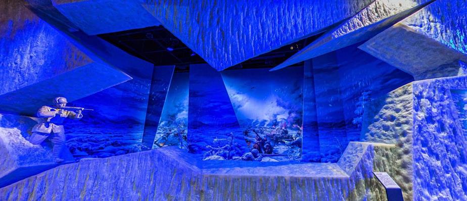 在抗美援朝戰爭歷程全景沙盤中,實景沙盤+LED光點演示全面展示抗美援朝戰爭進程,作戰雙方的進攻路線、戰斗態勢一目了然;在冰雪長津湖場景中,運用時空并序的方法設計背景油畫和近景,以裂開的冰塊為外形,通過聲、光、電展示志愿軍戰士在冰雪中鏖戰的悲壯場面;在家喻戶曉的奇襲白虎團場景中,選取了幻影成像+LED的手段來展示兩個不同的空間,在形式上令人耳目一新。
