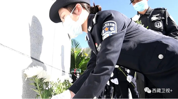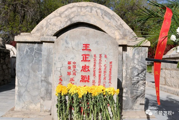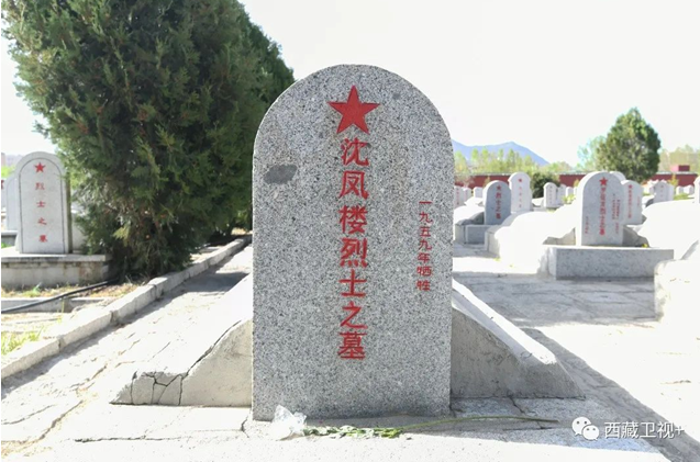 陵園正門上方用漢文和藏文書寫有“拉薩烈士陵園”,兩側刻有毛澤東的詩詞“為有犧牲多壯志,敢教日月換新天”。