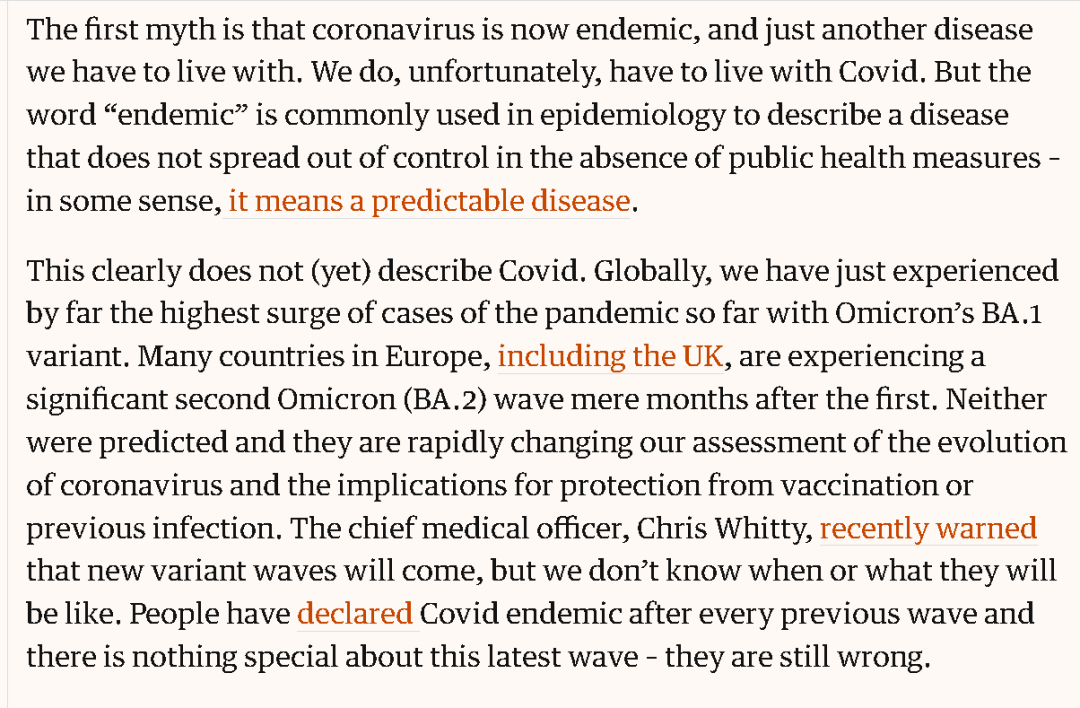 首先,人們誤以為新冠肺炎疫情已經“結束”了,誤以為新冠肺炎已經屬于與其他和人類“共存”的常見傳染病或“區域性流行病”(endemic)。但事實并非如此,因為新冠病毒的變異仍然難以預料,還在失控地傳播,比如,全球正在經歷奧密克戎BA.1變種毒株所引發的大面積感染,同時包括英國在內的歐洲又遭到了奧密克戎BA.2變異毒株沖擊,這明顯與可預測的“區域性流行病”的定義不符。