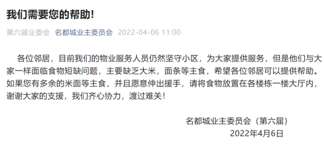各位鄰居,目前我們的物業服務人員仍然堅守小區,為大家提供服務,但是他們與大家一樣面臨食物短缺問題,主要缺乏大米,面條等主食,希望各位鄰居可以提供幫助。如果您有多余的米面等主食,并且愿意伸出援手,請將食物放置在各樓棟一樓大廳內,謝謝大家的支援,我們齊心協力,渡過難關!