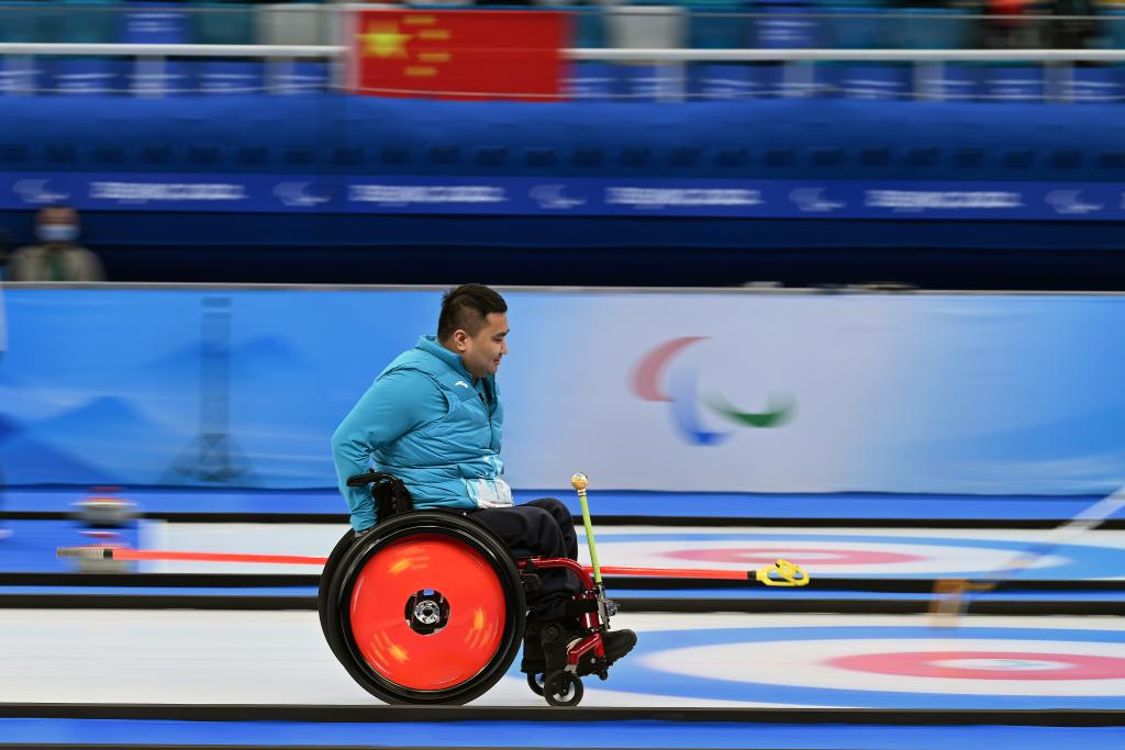 3月12日,北京2022年冬殘奧會(huì)輪椅冰壺金牌賽中,中國隊(duì)以8比3戰(zhàn)勝瑞典隊(duì),奪得冠軍,圖為中國隊(duì)選手王海濤在比賽中。新華社記者李尕?cái)z