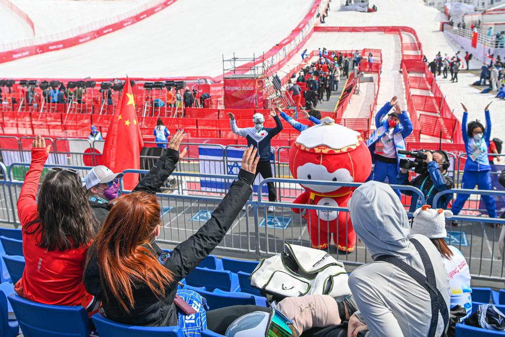 3月10日,在延慶國家高山滑雪中心,觀眾在開賽前與“雪容融”互動(dòng)。新華社記者江漢攝