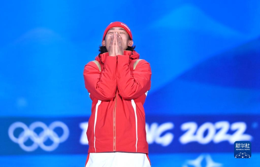 2月15日,在北京賽區(qū)頒獎(jiǎng)廣場(chǎng),冠軍中國(guó)隊(duì)選手蘇翊鳴在北京2022年冬奧會(huì)單板滑雪男子大跳臺(tái)獎(jiǎng)牌頒發(fā)儀式上。新華社記者 黃宗治 攝