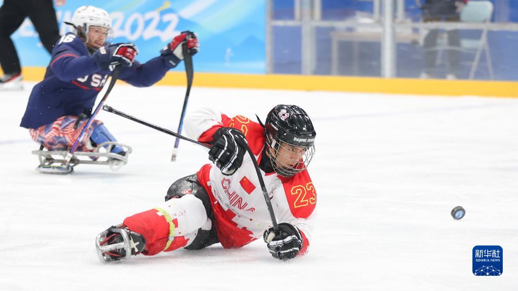 3月11日,在北京國(guó)家體育館,中國(guó)隊(duì)球員崔玉濤(右)在北京2022年冬殘奧會(huì)殘奧冰球半決賽中。新華社記者 馬希平 攝