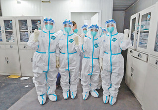 4月8日晚,隨著海南省援滬醫(yī)療隊近百名醫(yī)護人員的進駐,上海嘉定南翔方艙醫(yī)院正式投入運行。圖為醫(yī)護人員在入艙前加油鼓勁。 新華社記者 李 賀攝