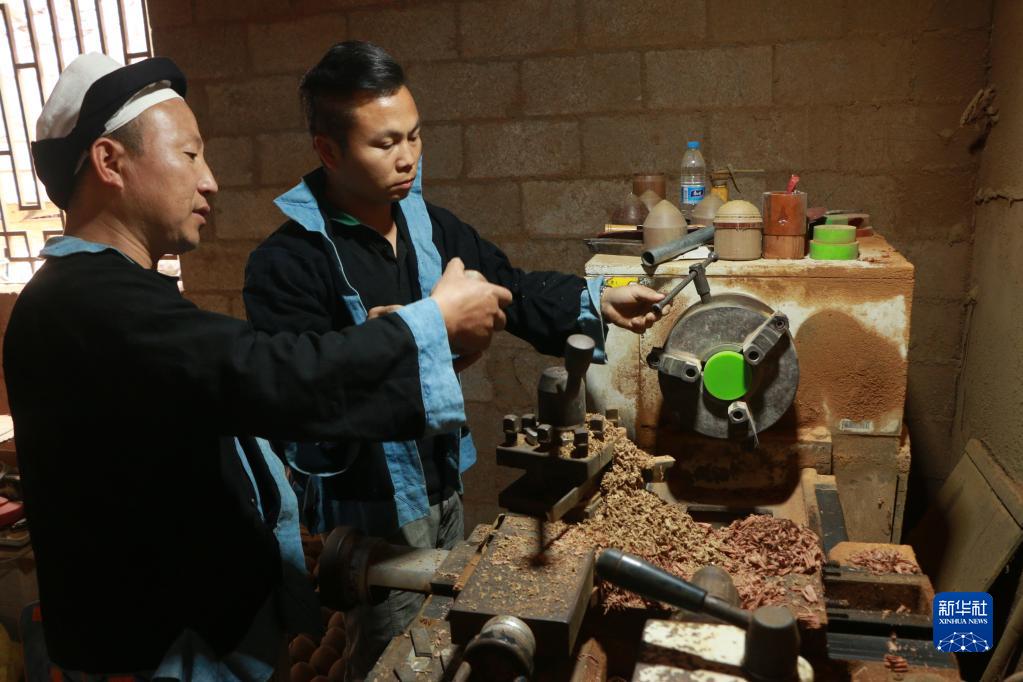 謝友明(左)跟徒弟在趕制陀螺(4月6日攝)。新華社記者 齊健 攝