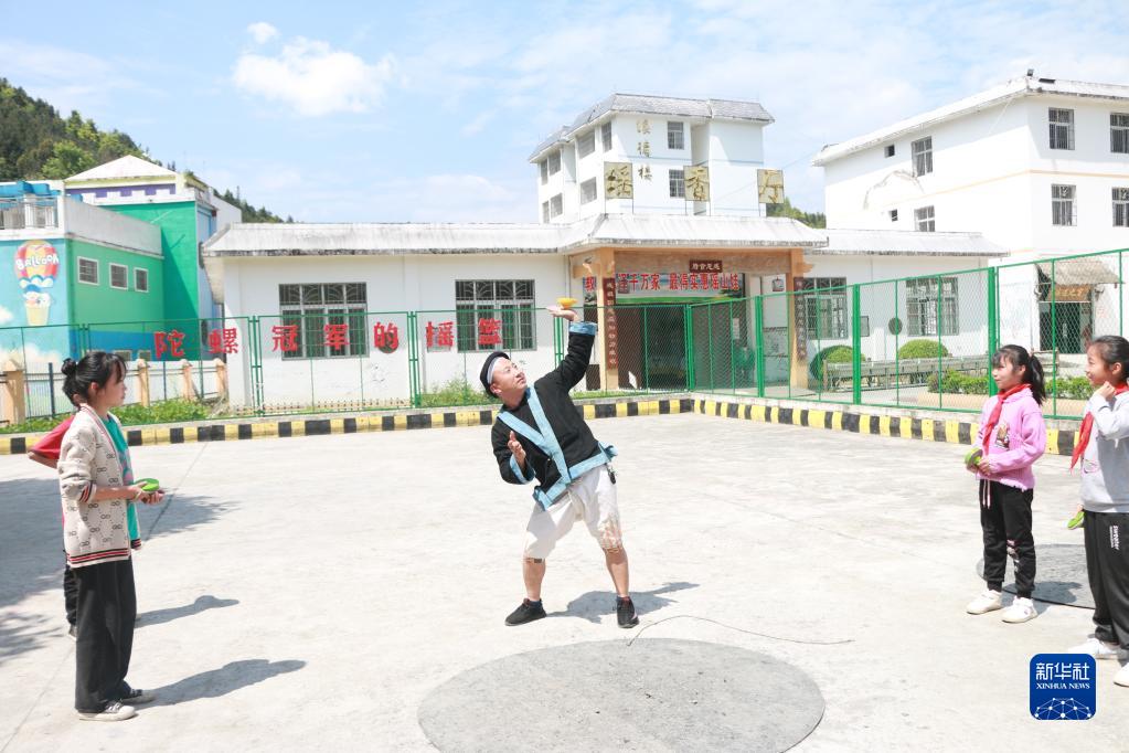 謝友明(中)在給瑤山民族小學的學生表演花式陀螺(4月6日攝)。新華社記者 齊健 攝