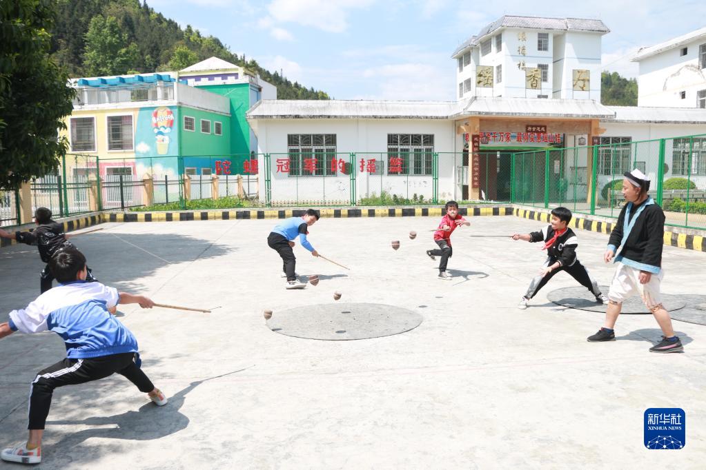 瑤山民族小學的學生在練習競技陀螺(4月6日攝)。新華社記者 齊健 攝