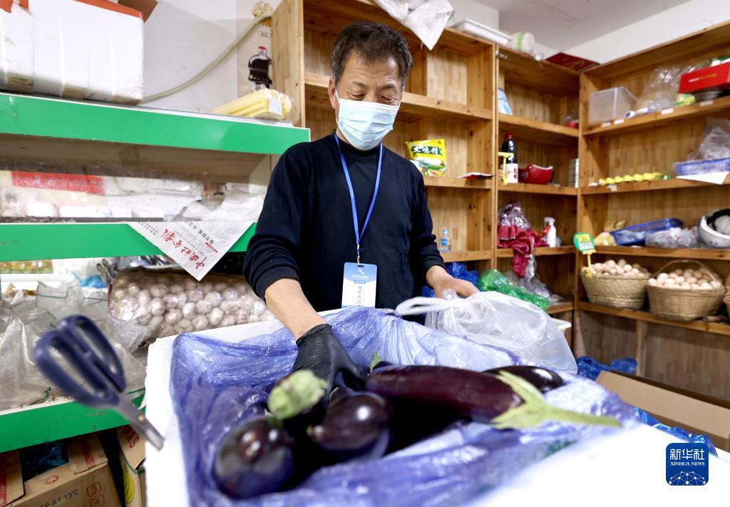 4月10日,上海超杰綜合生鮮超市員工徐啟銀在恢復營業(yè)的店內(nèi)為網(wǎng)上訂單分裝蔬菜。