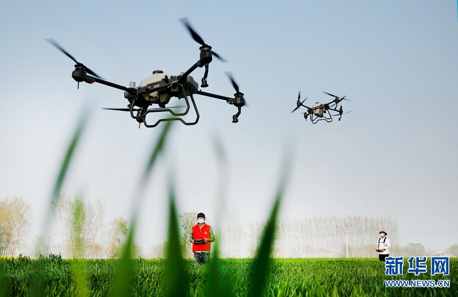 4月7日,河南省開封市尉氏縣南曹鄉(xiāng)馮莊村,植保隊隊員在對小麥田進行“一噴三防”作業(yè)。