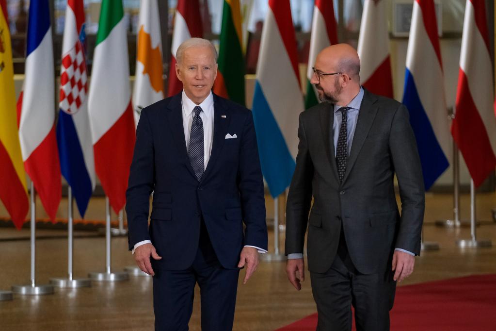 3月24日,美國總統(tǒng)拜登(左)和歐洲理事會主席米歇爾抵達(dá)歐盟總部。正在布魯塞爾訪問的美國總統(tǒng)拜登24日說,他支持將俄羅斯排除在二十國集團(tuán)之外。拜登當(dāng)天抵達(dá)布魯塞爾,出席北約、七國集團(tuán)和歐盟三場峰會。他在北約總部召開的記者會上說,如果二十國集團(tuán)不排除俄羅斯,至少也應(yīng)邀請烏克蘭參加會議。新華社記者張鋮攝