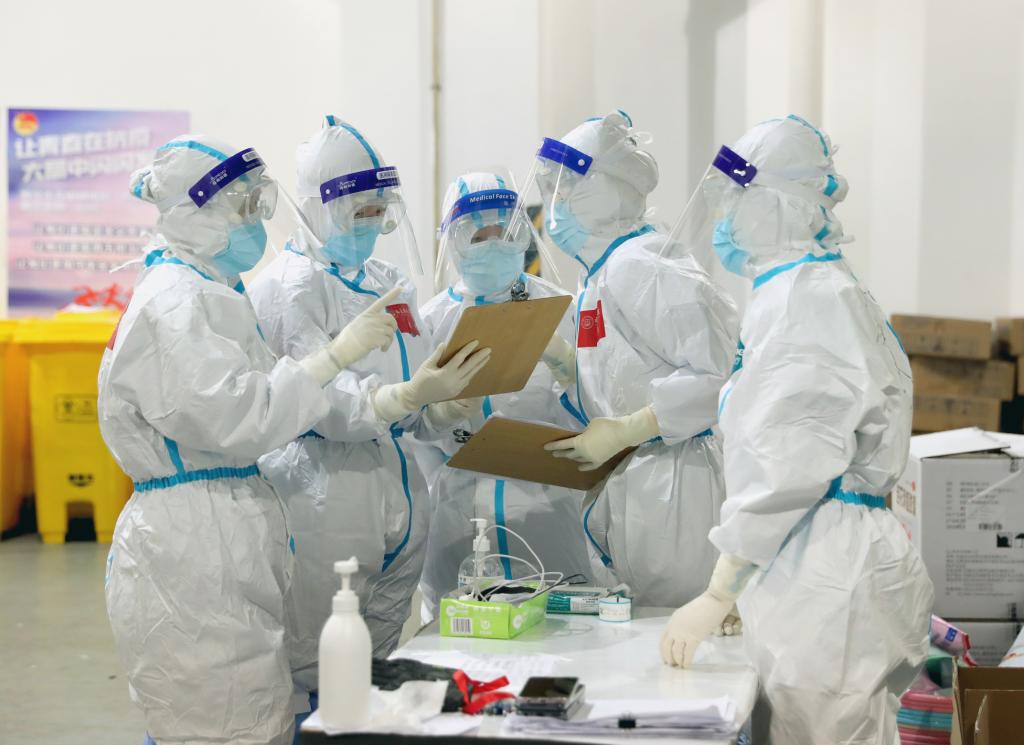 4月11日,世博展覽中心方艙醫(yī)院的醫(yī)務(wù)人員討論工作。新華社發(fā)(劉曉晶 攝)