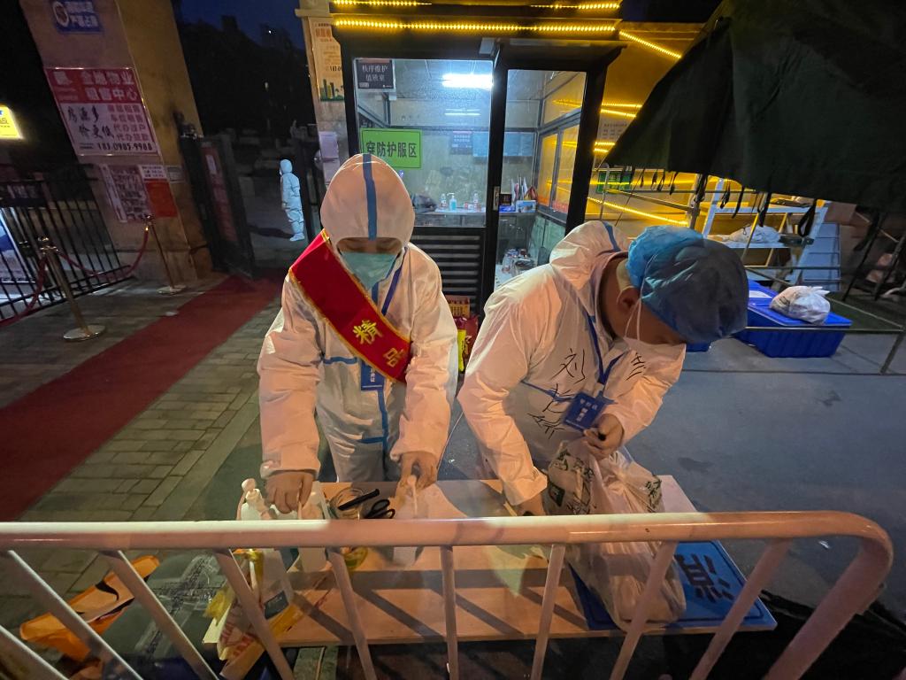 3月26日,志愿者在封控小區(qū)外整理消毒快遞物品。(新華社記者李昂 攝)