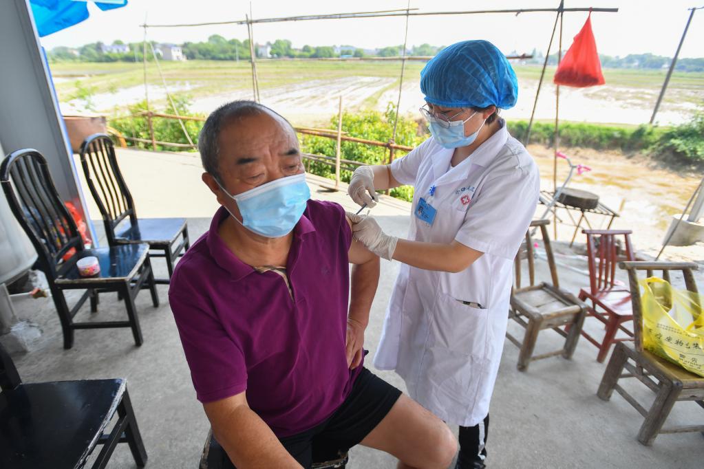 4月11日,在長(zhǎng)沙市望城區(qū)喬口鎮(zhèn)團(tuán)頭湖村,醫(yī)護(hù)人員上門為腿腳不便的老年人接種新冠疫苗。(新華社記者陳澤國(guó) 攝)