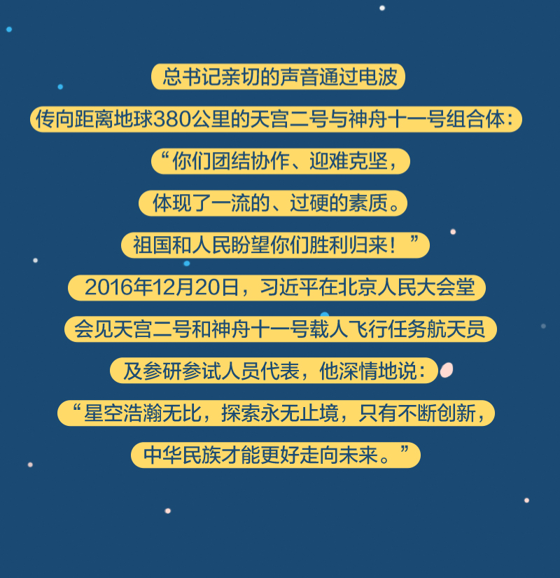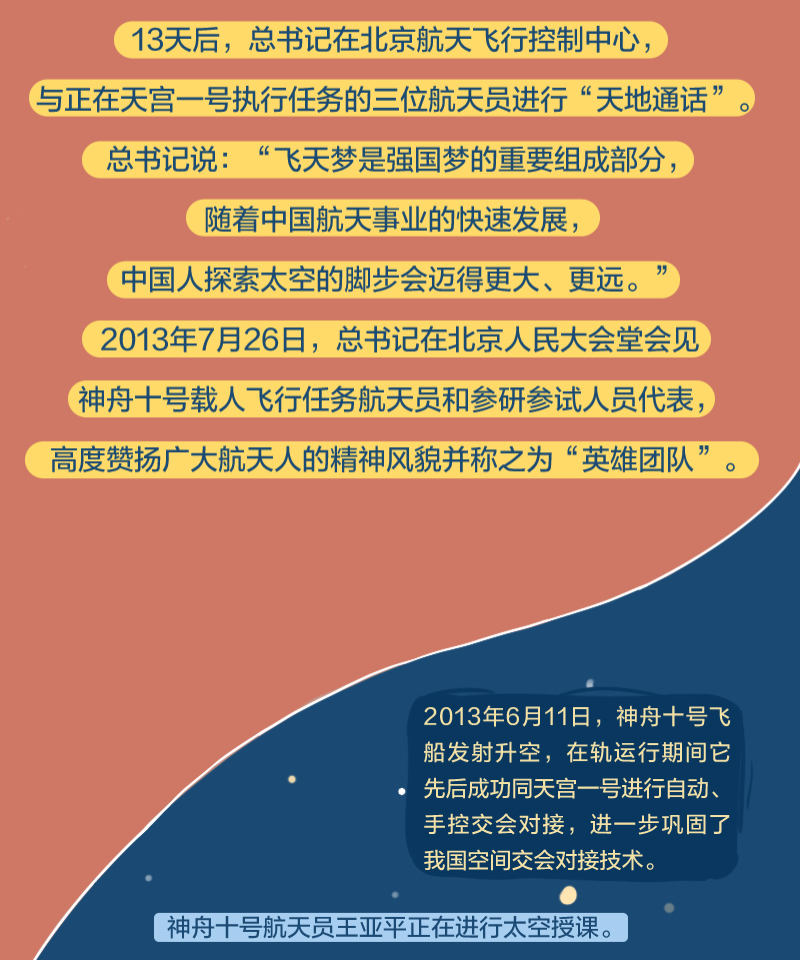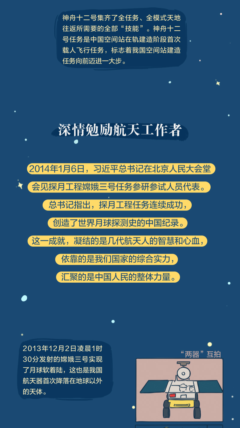 黨的十八大以來,總書記始終高度關(guān)注我國航天事業(yè)發(fā)展,多次同執(zhí)行任務(wù)的航天員展開“天地通話”、給參與“東方紅一號(hào)”任務(wù)的老科學(xué)家回信、親切接見航天工作者、深情寄語航天人……