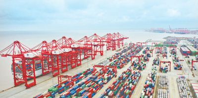 圖為4月15日拍攝的上海洋山港集裝箱碼頭。新華社記者 丁 汀攝