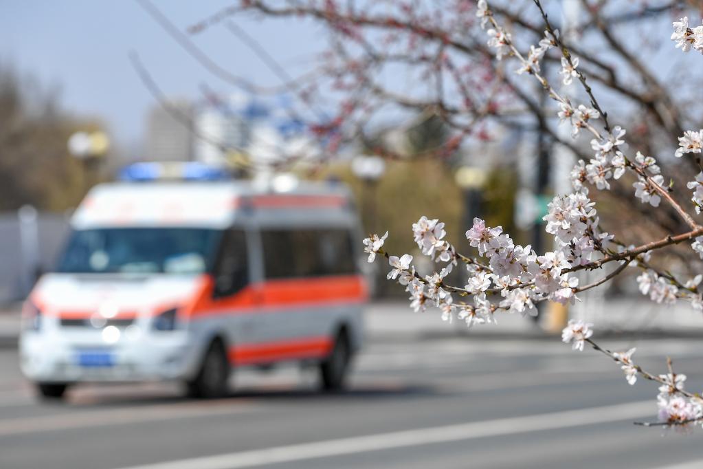 4月14日,一輛救護車在吉林省吉林市松江東路上駛過,路邊桃花已經盛開。當日,吉林省宣布實現疫情防控社會面清零。新華社記者張楠攝